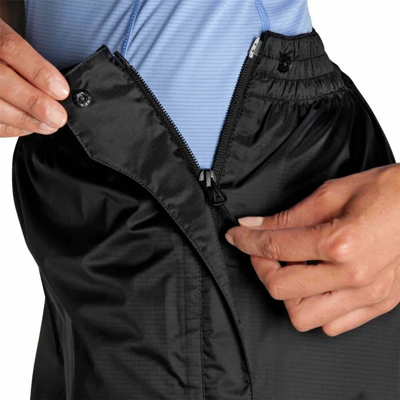 The Apollo pants have a rear zipped pocket which is rare on an over trouser. The trousers can be packed into this pocket which has an integrated clip on loop. The waist hem is elasticated and the ankles can be cinched in.